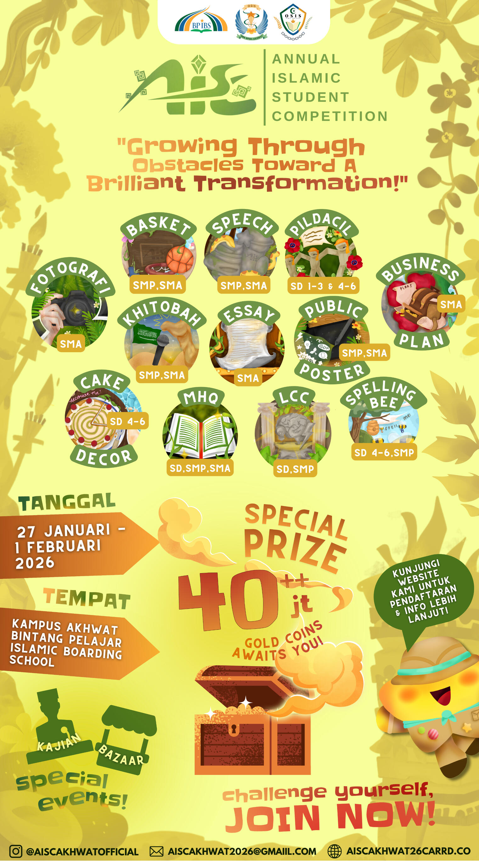 AISC (Annual Islamic Student Competition) BPIBS 2026 merupakan acara tahunan dan merupakan salah satu program OSIS SMA dan SMP Bintang Pelajar Islamic Boarding School. Kegiatan ini dilaksanakan dalam berbagai kompetisi yang diikuti oleh kalangan siswa dan siswi baik jenjang SD, SMP, maupun SMA. Acara ini bertujuan untuk mengasah kemampuan kreativitas para pelajar serta meningkatkan keberanian, rasa percaya diri, dan jiwa kompetitif yang sehat dan positif sehingga memusnahkan mental lemah yang mengakar pada diri generasi muda.Pada tahun ini, AISC 2026 mengangkat tema “Growing Through Obstacles Toward a Brilliant Transformation” yang berfokus pada pengembangan dan penguatan generasi muda dari segi karakter, kecerdasan, mental dan fisik dalam menghadapi berbagai situasi dan kondisi serta sebagai pioneer dalam menggerakkan perubahan menuju masa depan yang lebih baik.
